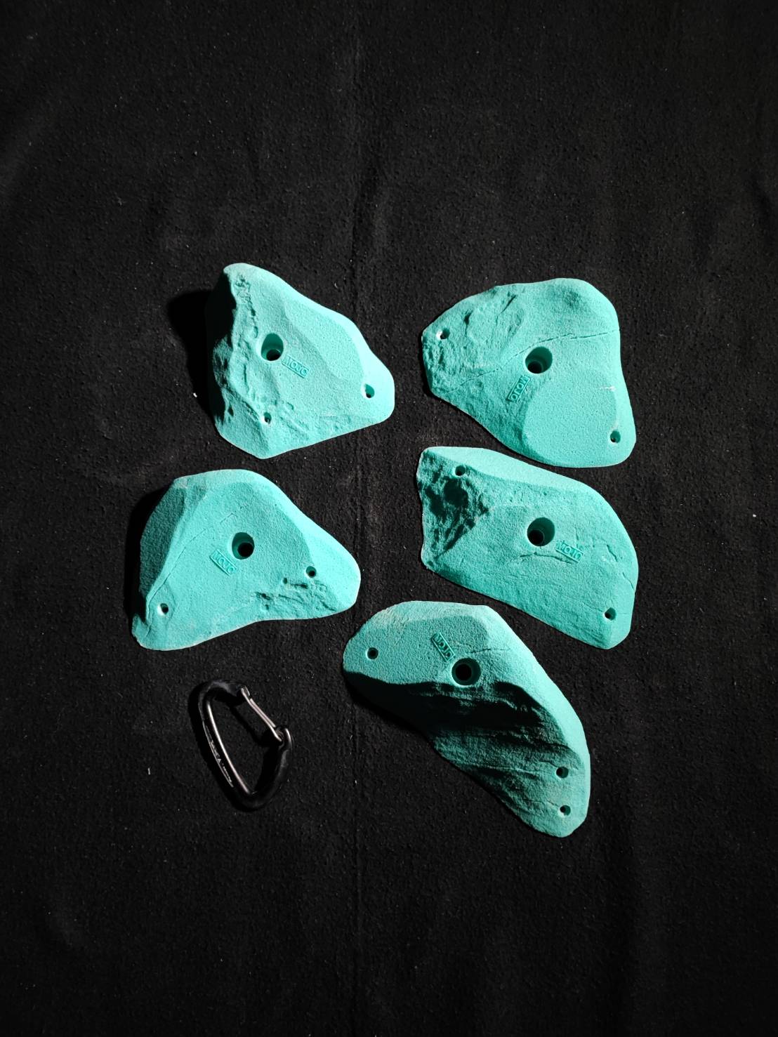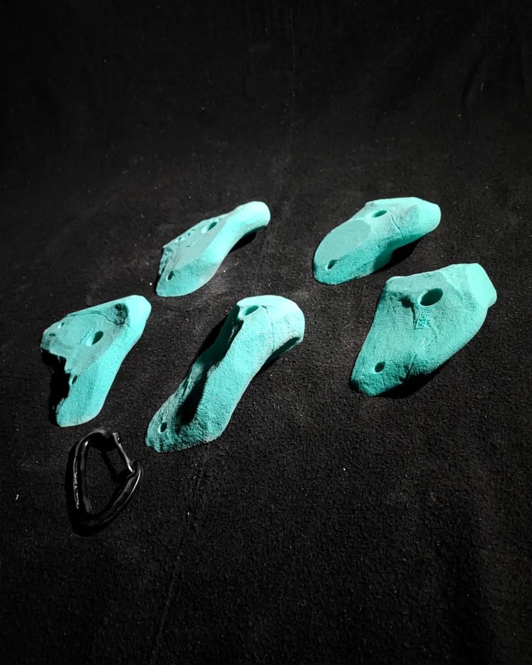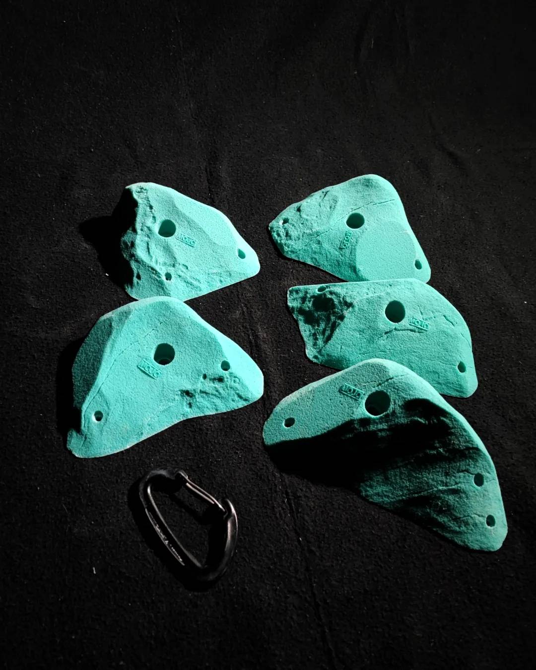 This is a set of small-sized jugs. Compared to the M Handjug, these have a more flake-like jug feel. The holding surface is slightly thinner, so even among jugs, it puts a bit more weight on the fingertips. Each piece's unique design adds variety to lower-grade routes.